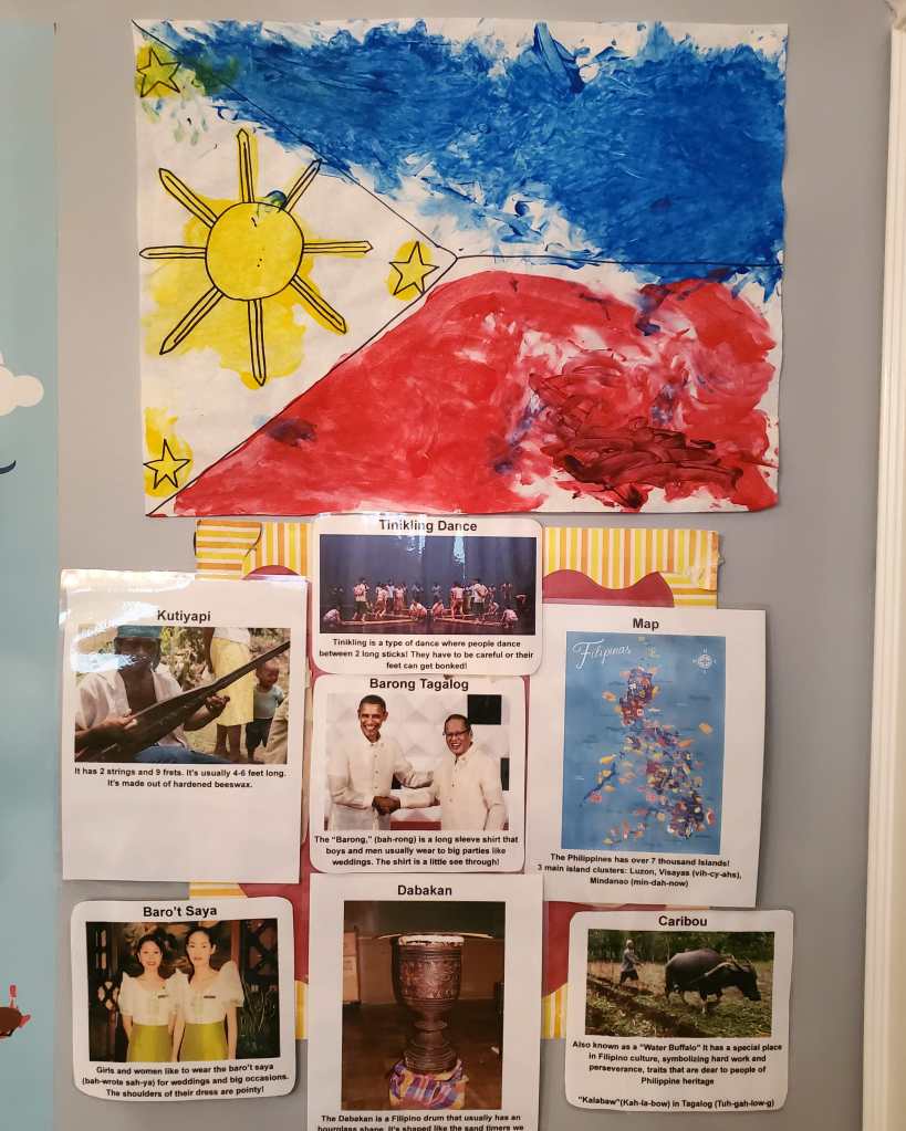 October is Filipino American history month. Every month, we teach the kids at my school about a new country. This month, I chose the Philippines. Over the years I have seen the Bay Area, but San Francisco is particular, changing. And changing fast. And it’s nice to teach my 1.5 – 2 1/2 year old students about my culture and traditions. One of my students got picked up and told her mom she painted a flag for activity. Her mom asked if she remembered what country’s flag she painted. My student responded with, “Well, it’s where teacher Marinelle’s mom and dad is from.”