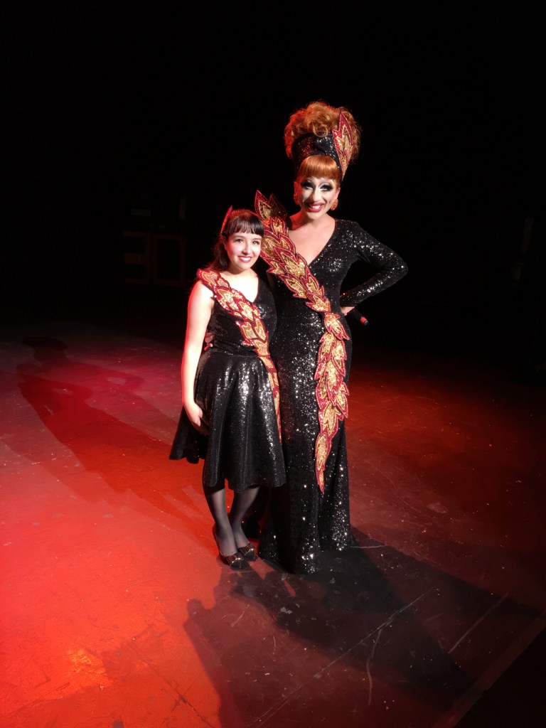 Elena on stage at The Warfield with Bianca Del Rio, wearing their matching Flames Dresses