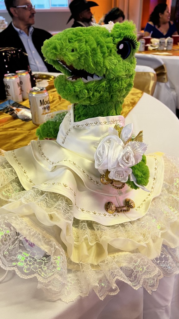 “Recently I did a Quince dress for a Build-a-Bear Dino for my cousin’s Quinceñera!,” She shares passionately. “Traditionally during the party, a Quinceñera is presented with ‘La Ultima Moñeca’ aka ‘The Last Doll.’ It is to signify that she is no longer a little girl and is now an adult who doesn’t play with toys. I let my cousin pick a stuffed animal from Build-a-Bear and I created a 1 to 1 dress based on her Quince dress!”