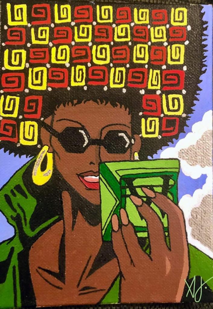 For Lex, representation is everything. Her art gravitates towards her feminine energy. She absolutely loves painting women of color. Lex appreciates all the love and support that she receives from women who resonate with her work. This is really important to her because the margin of women in art galleries are about 3% of the total, leaving the other 97% to men. So she makes it a point to represent the women of color who are not represented in the art scene. Lex loves to paint women with really curly hair. Her Black, Honduran, and Guatemalan roots shine through her pieces. She knows that women of color will only make it in mainstream media if women of color continue to push out content of women of color.